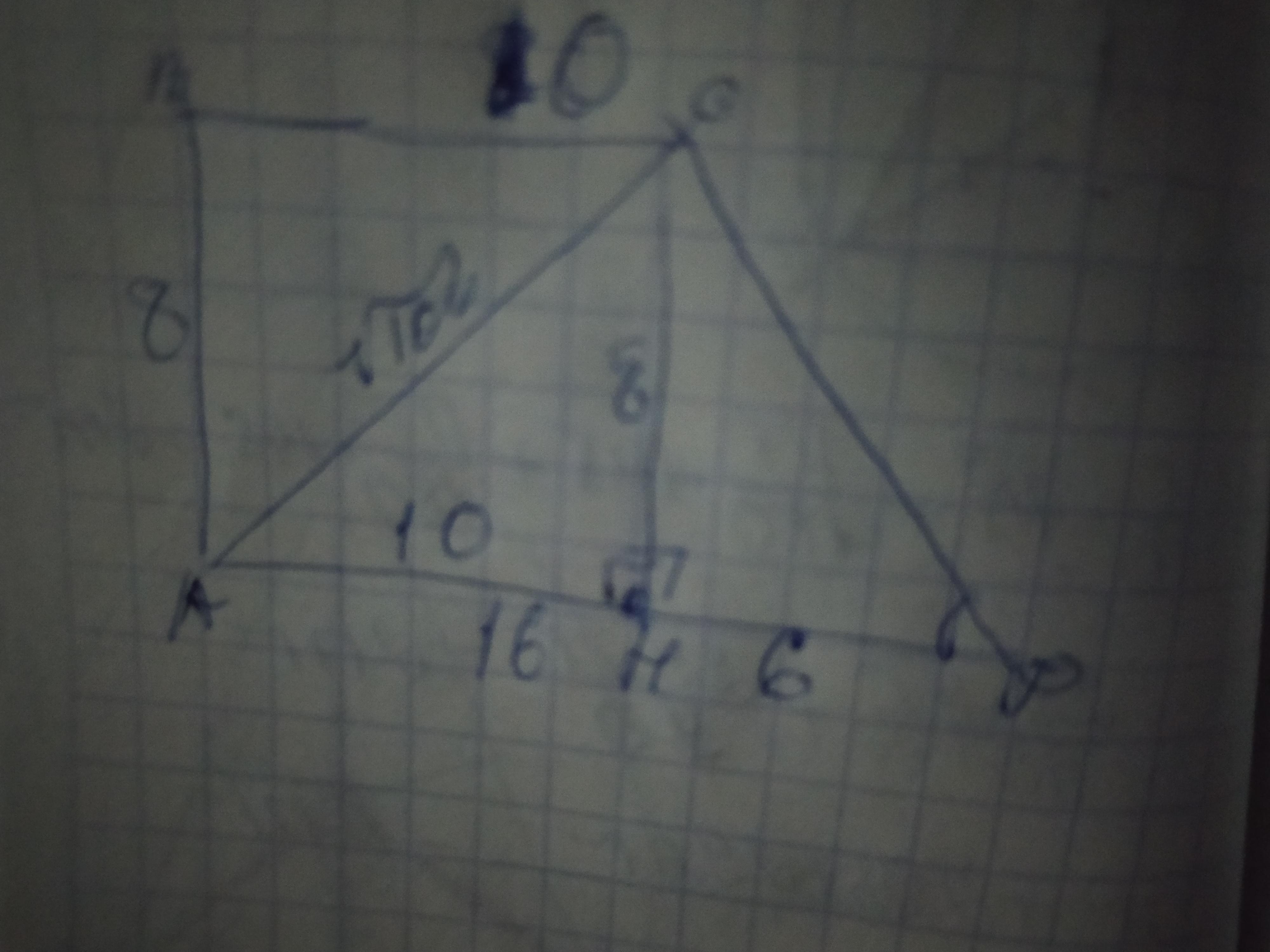 Проведём высоту СН к основанию АД. Она делит АД так, что АН=ВС=10см, а высота СН=АВ=8см. Соответственно DH=16-10=6см. Рассмотрим полученный ∆СДН, он прямоугольный, где СН и ДН- катеты, а СД - гипотенуза. Найдём гипотенузу СD по теореме Пифагора: СD²=СН²+СD²=64+36=100;