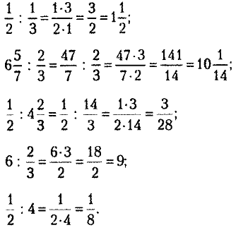 Действие деления обратно действию умножения. Определение действия деления для натуральных чисел сохраняет свое значение и для обыкновенных дробей. Правила деления зависят от вида делимого и делителя.Внимание! На нуль делить нельзя!Для правильных и неправильных дробей правило деления следующее.Правило. Чтобы разделить обыкновенную дробь, надо числитель делимого умножить на знаменатель делителя, а знаменатель делимого умножить на числитель делителя. Первое произведение взять числителем, а второе — знаменателем.Чтобы разделить обыкновенные дроби, можно делимое умножить на дробь, обратную делителю.Чтобы выполнить деление смешанных дробей, надо сначала перевести смешанную дробь в неправильную, а