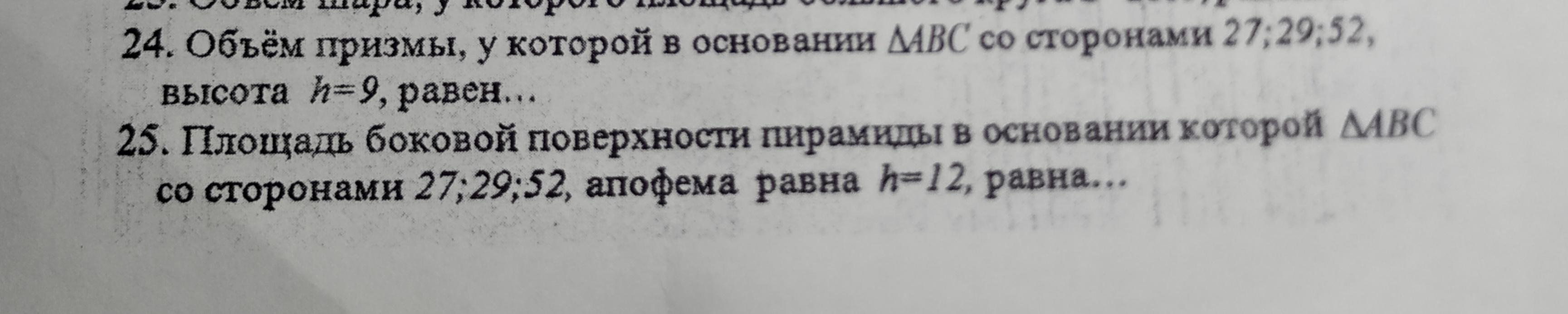 2) Sбок пов пир.=(P*l)/2=((27+29+52)*12)/2=648 cм^2