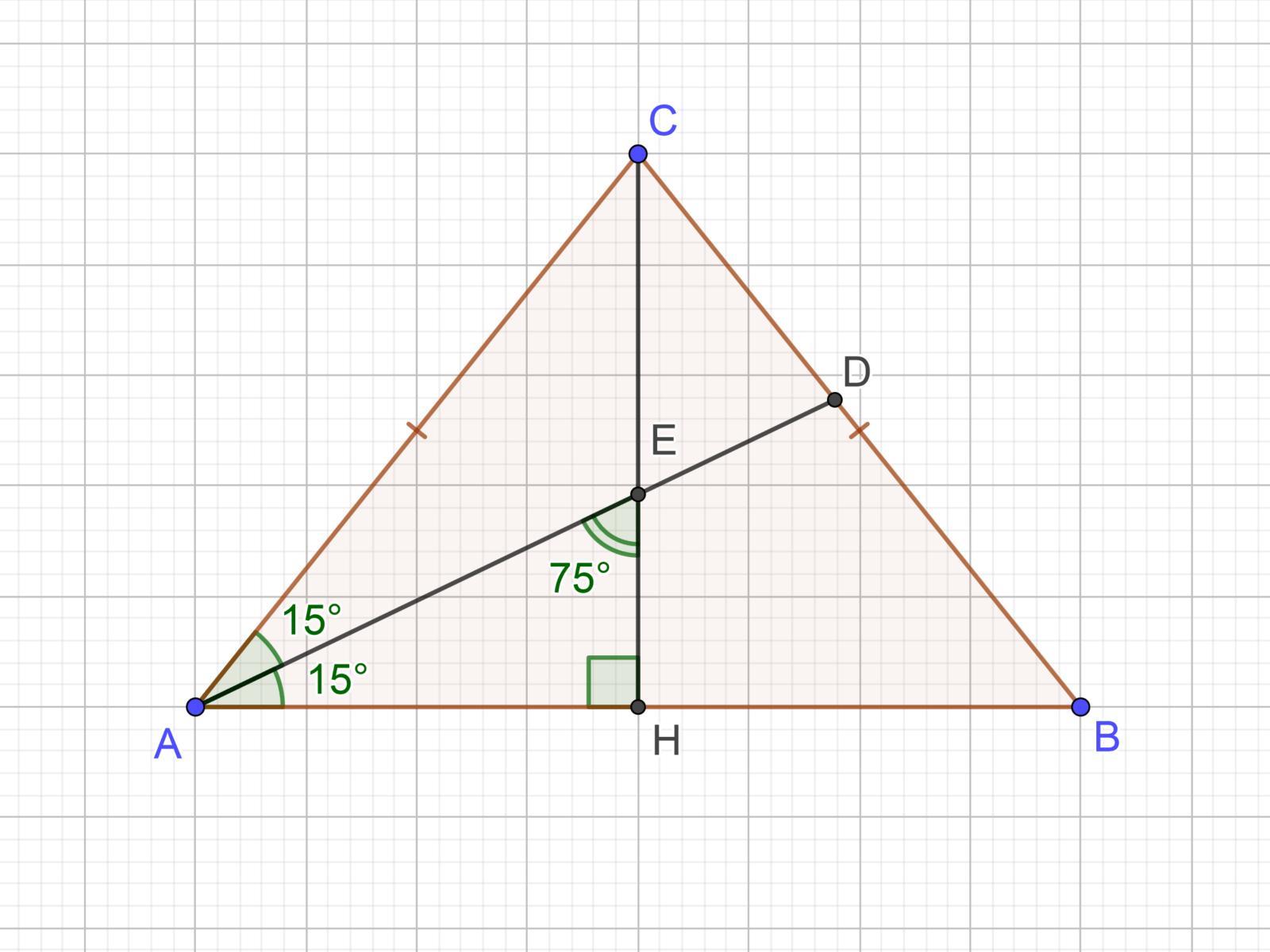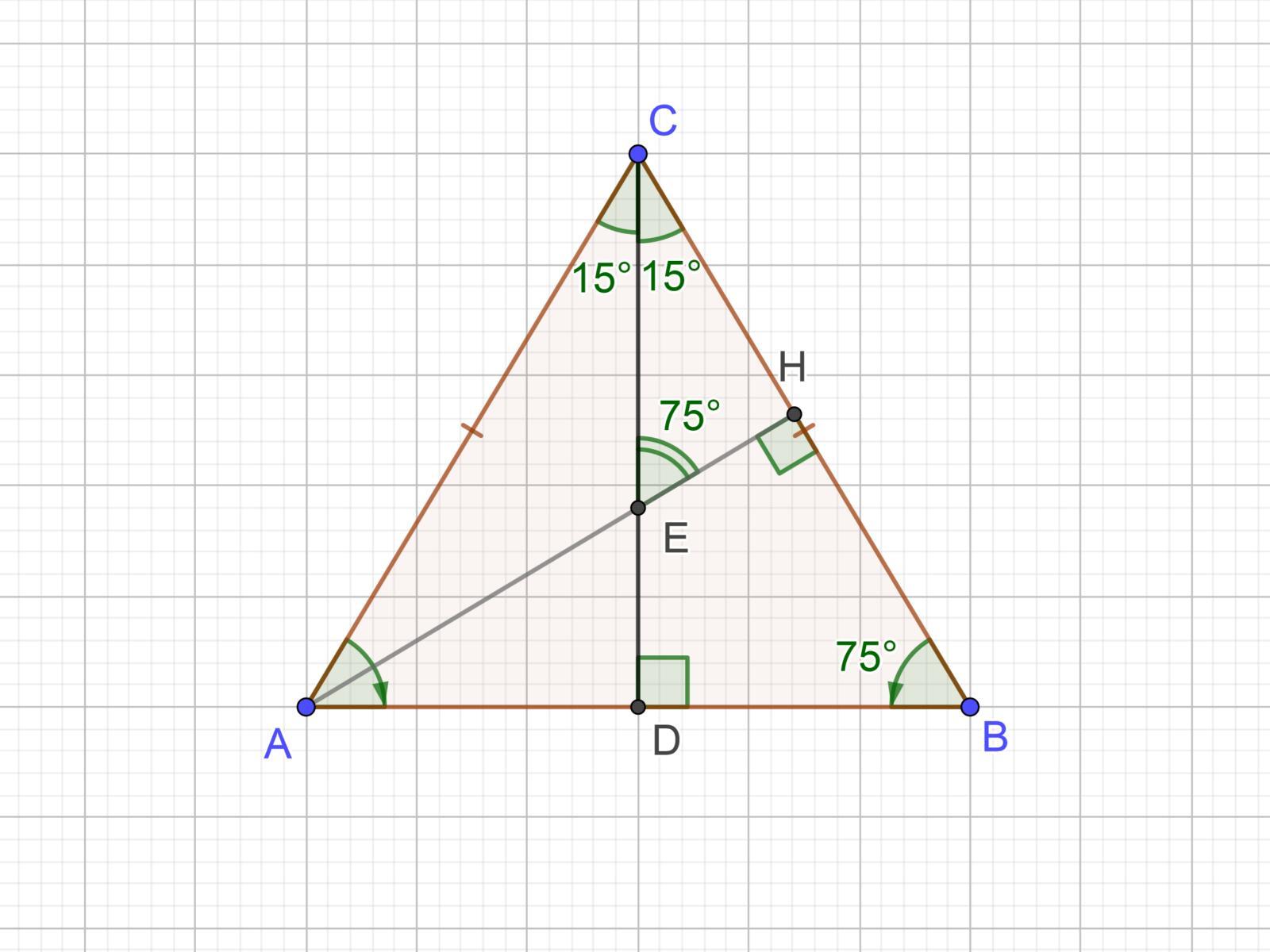 ∠A = ∠B = 90°−∠ECH = 90°−15° = 75° (т.к. ΔCBD — прямоугольный, ∠CDB = 90°).