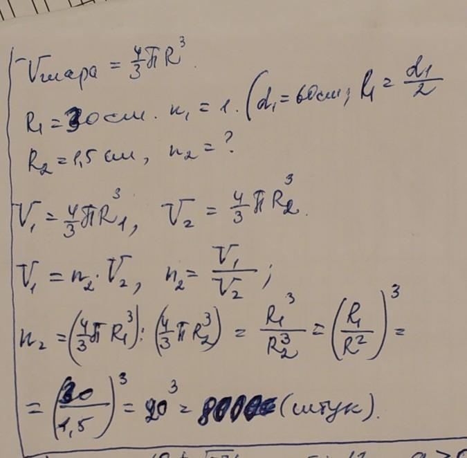 Какое число шариков радиусом 1,5см получится, если перелить в них свинцовый шар диаметром в 60см? срочнооооо