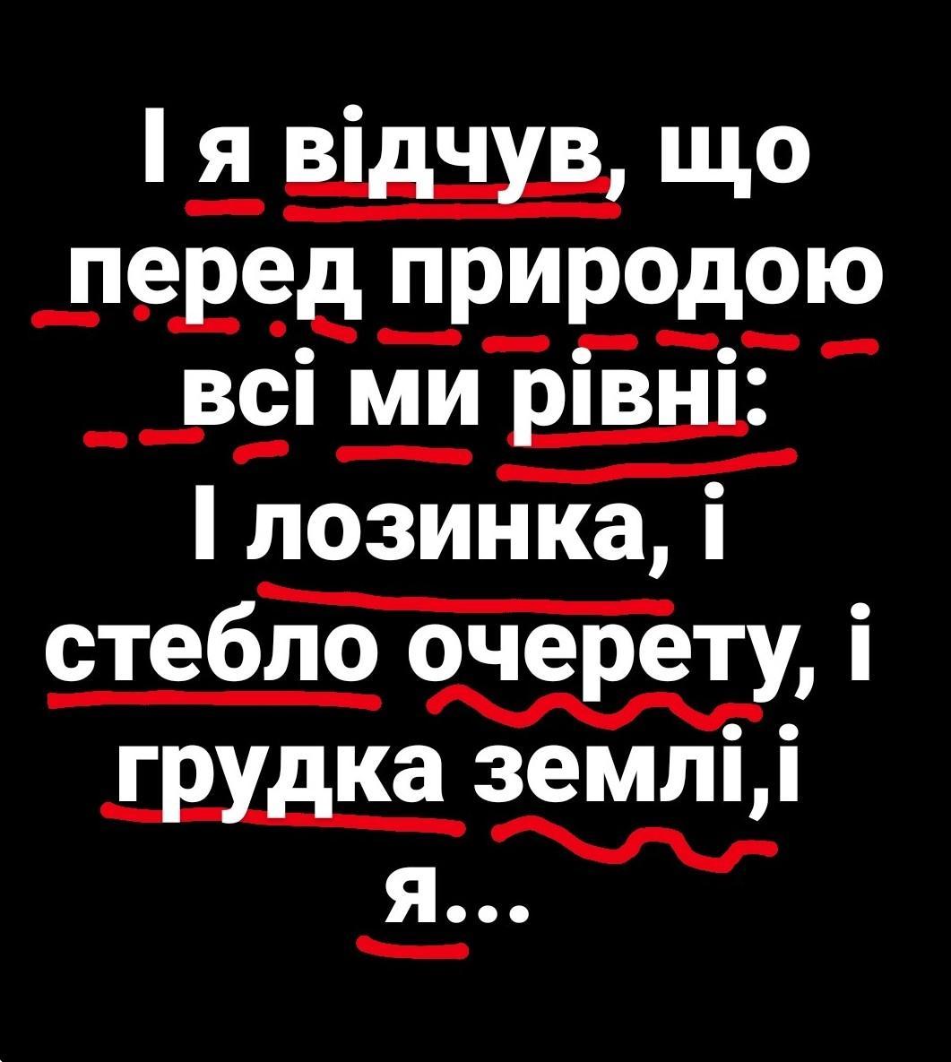 І я відчув, що пред природою всі ми рівні: і лозинка, й стебло очерету, і грудка землі, і я...