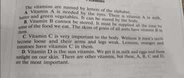 D . Витамин D - это солнечный витамин. Мы получаем его из молока, яиц и солнечного света на коже. Есть и другие витамины, но А, В, С и D являются наиболее важными.