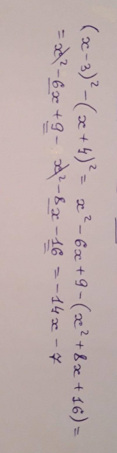 (х-3)²-(х+4)²=x²-6x+9-(x²+8x+16)=x²-6x+9-x²-8x-16=-14x-7=-7(2x+1)