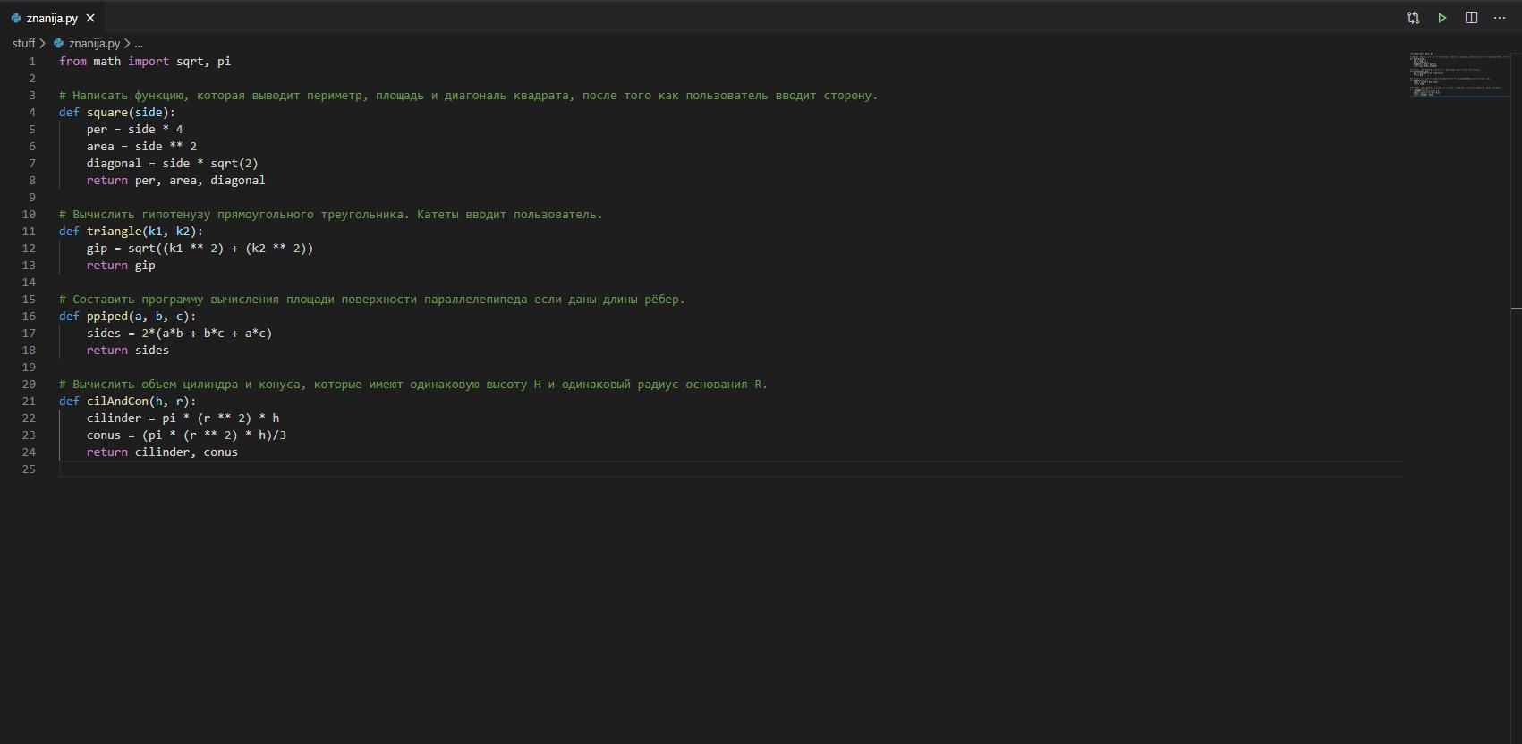 1. Написать функцию, которая выводит периметр, площадь и диагональ квадрата, после того как пользователь вводит сторону.
