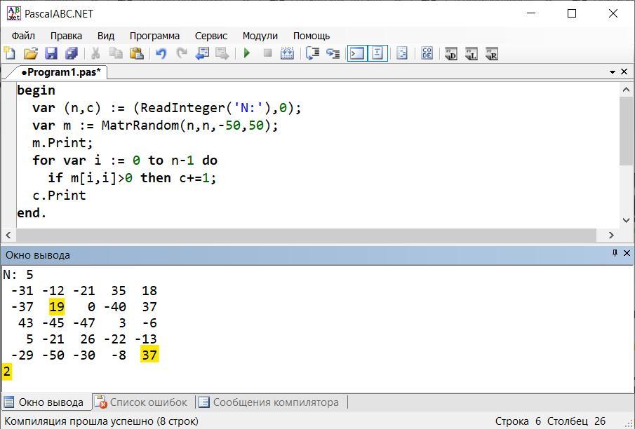 Найти количество положительных элементов, лежащих на главной диагонали квадратной матрицы. Матрица заполняется случайными числами от -50 до 50.