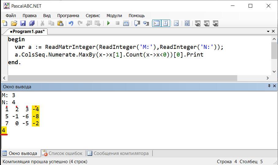 - a.Cols.Numerate.MaxBy(x->x[1].Count(x->x<0))[0].Print