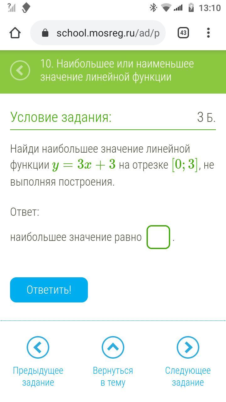 Объяснение: фУНКЦИЯ У=3Х+3 ВОЗРАСТАЮЩАЯ ПРИ ЛЮБОМ Х, НА ОТРЕЗКЕ ОТ 0 ДО 3 НАИБОЛЬШЕЕ ЗНАЧЕНИЕ ПРИНИМАЕТ ПРИ Х=3, Т.Е. У(3) = 3*3+3=12 у=3·3+3=12