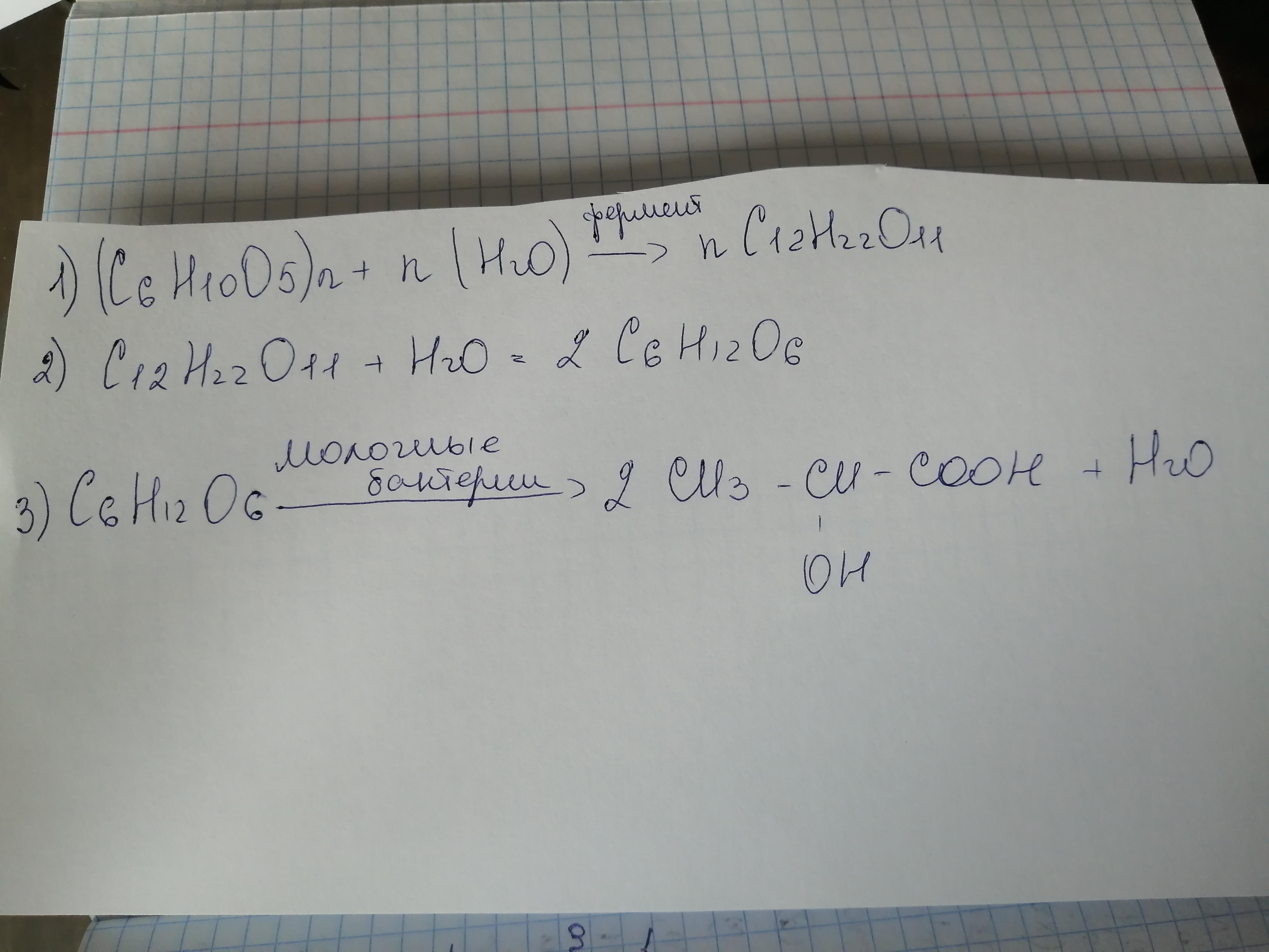 Крахмал->мальтоза->глюкоза->молочная кислота