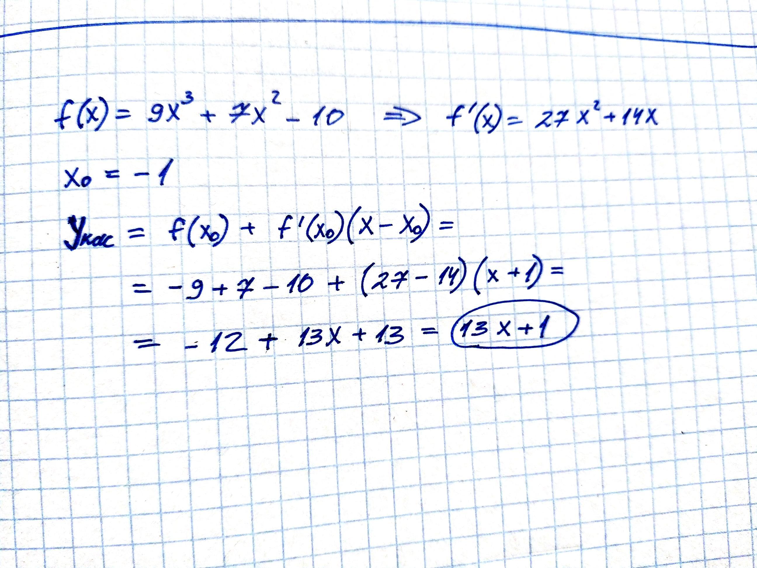 Составить уравнение касательной к функции f(x)=9x^3+7x^2-10 в точке Хо=-1