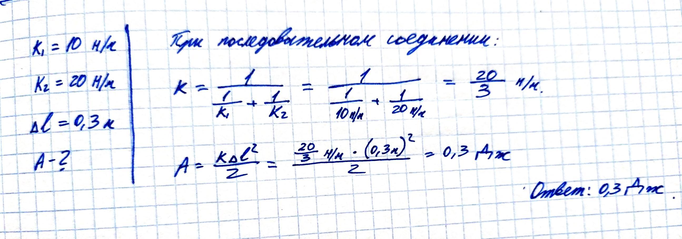 Имеются две пружины с жесткостью К1 = 10 Н/м, К2 = 20 Н/м. Пружины соединили последовательно и растянули на 0,3 метра. Какую работу при этом совершили.