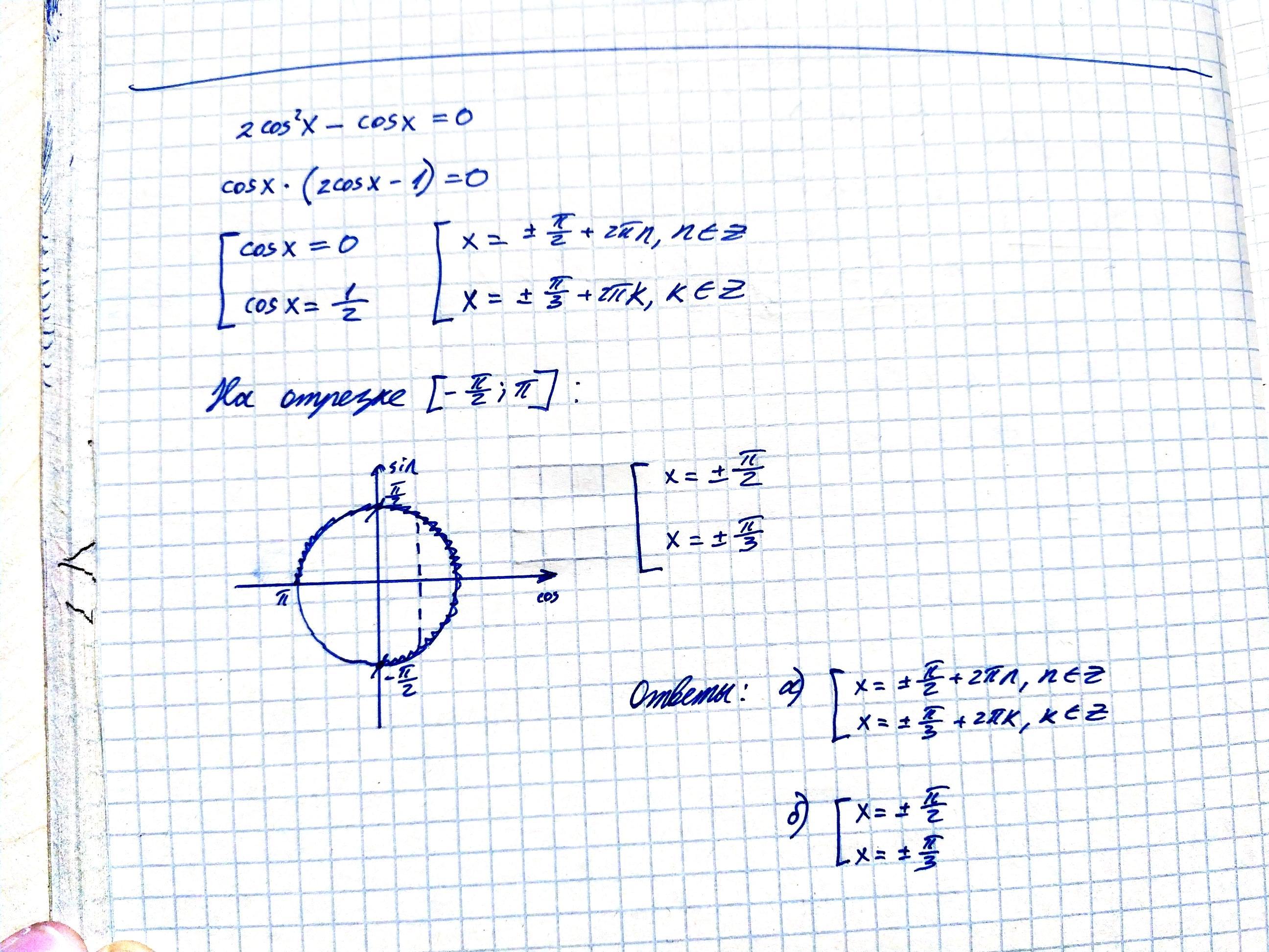 2cos²x-cos x=0 на промежутке [ -π/2;π]