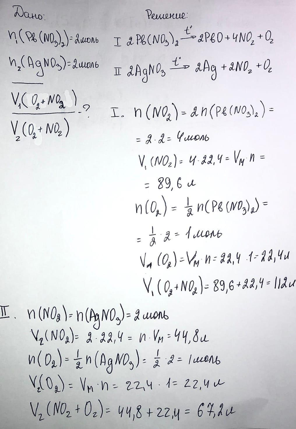 Во сколько раз больше объем газообразных веществ, полученных при разложение 2 моль Pb(NO3)2,чем объем газообразных веществ, полученных при разложение 2 моль AgNO3?