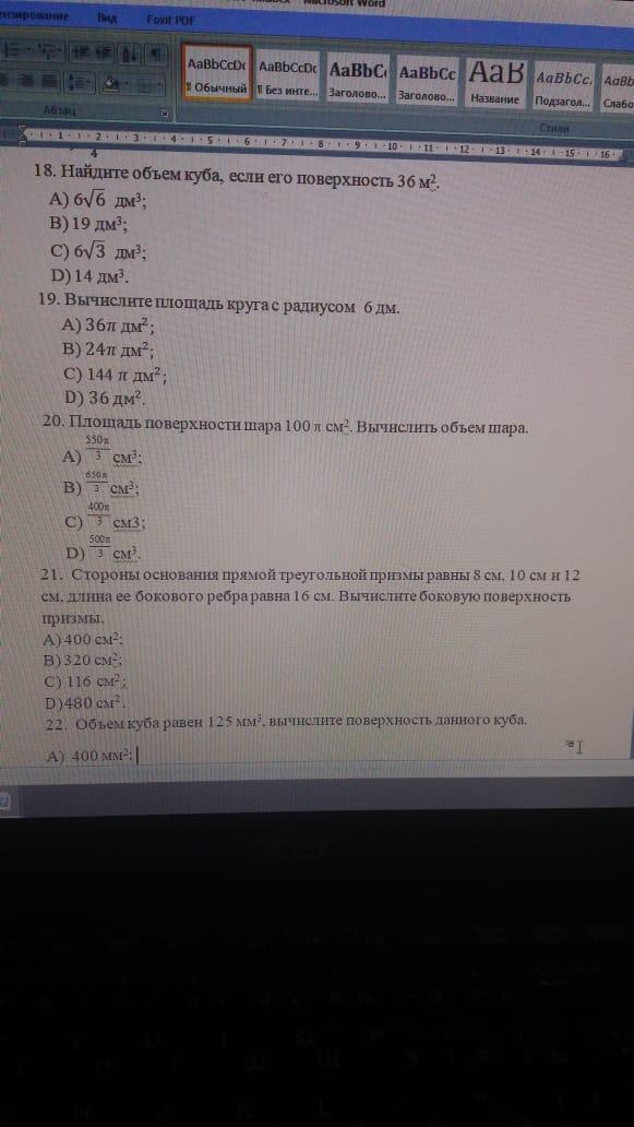 6√6; 36πдм²; 500π/3 см³; 480см³; 150мм²