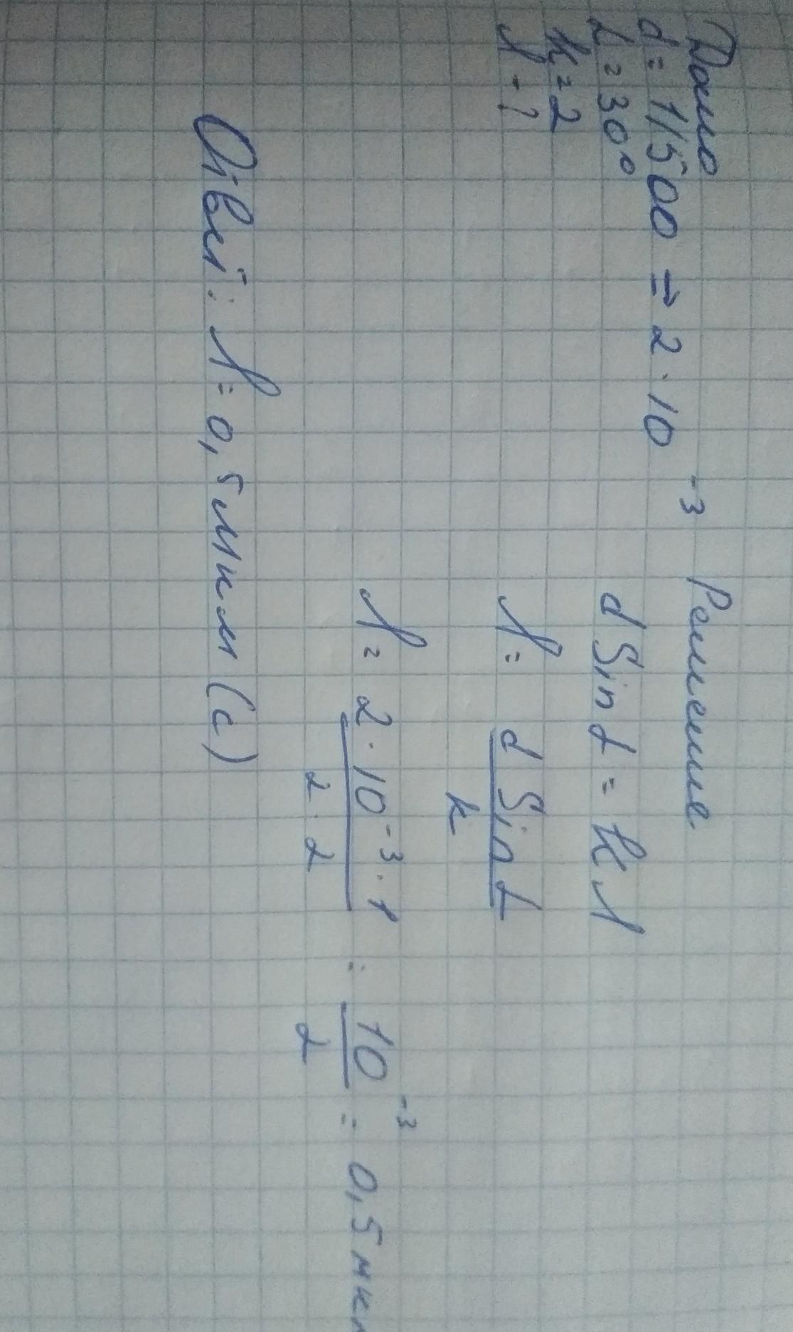 на дифракционную решетку с периодом 1/500 мм падает монохроматический свет.Нсли максимум второго порядка отклоняется на 30⁰ при прохождении через дифракционную решётку,то длина волны света равна?