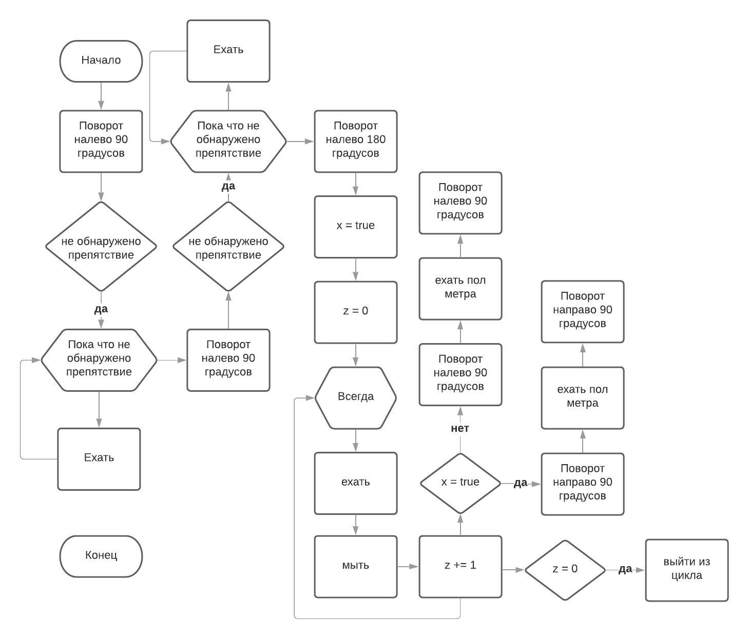 Есть робот уборщик. Может ехать вперед и поворачивать при обнаружении датчиком препятствия. нарисовать алгоритм уборки помещения (пустого). Нарисовать примерную траекторию движения. Усложнение написать на языке программирования (управление движением упрощенно например «вперед 1с.»)