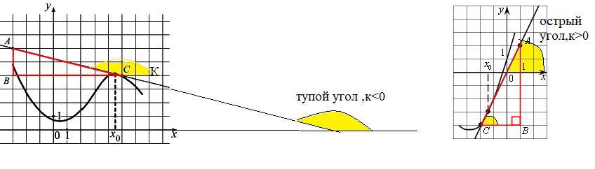 При построении касательной нужно выбирать точки с целочисленными значениями . Например, A (−3; 6), B (−3; 4), C (5; 4). Если касательная составляет с положительным направлением оси ох тупой угол, значит к<0