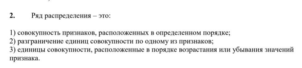 Ряд распределения — представляет собой упорядоченное распределение единиц изучаемой совокупности на группы по определенному варьирующему признаку.