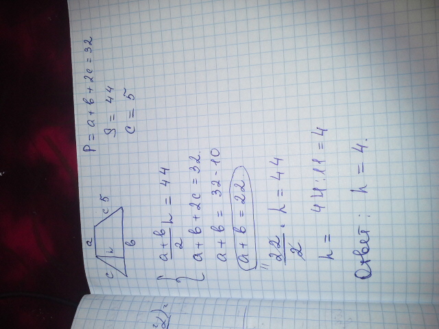 Периметр равнобедренной трапеции равен 32 см боковая сторона равна 5 см,площадь равна 44 квадратных сантиметра.Найти высоту.Помогите пожалуйста