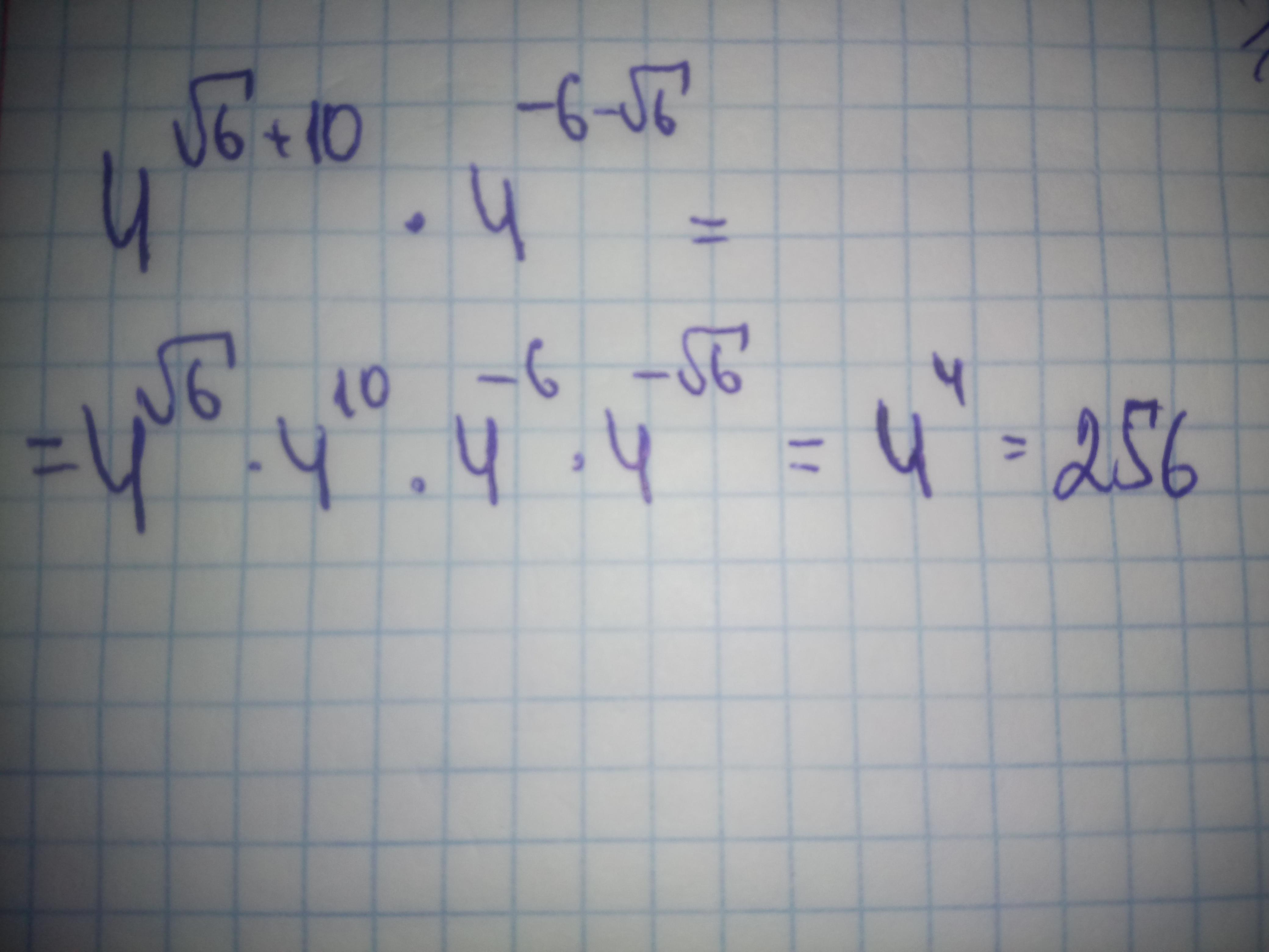 4^(√(6) + 10) × 4^(-6 - √(6)) = 4^(√(6) + 10 - 6 - √(6)) = 4^4 = 256.