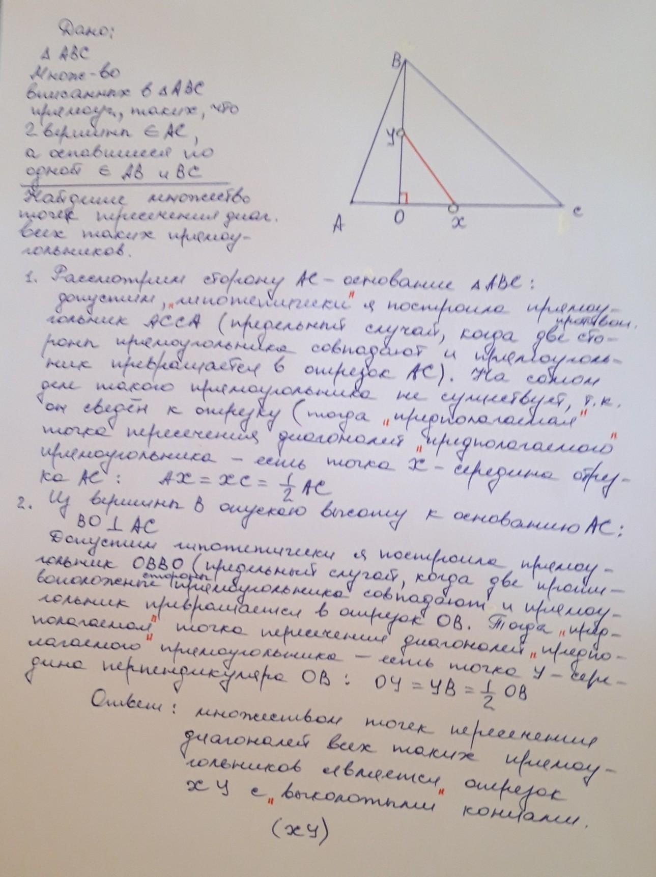 На плоскости задан остроугольный треугольник АВС. Найдите множество точек пересечения диагоналей всех прямоугольников, у которых две вершины лежат на стороне АС, а оставшиеся две вершины - на сторонах АВ и ВС .