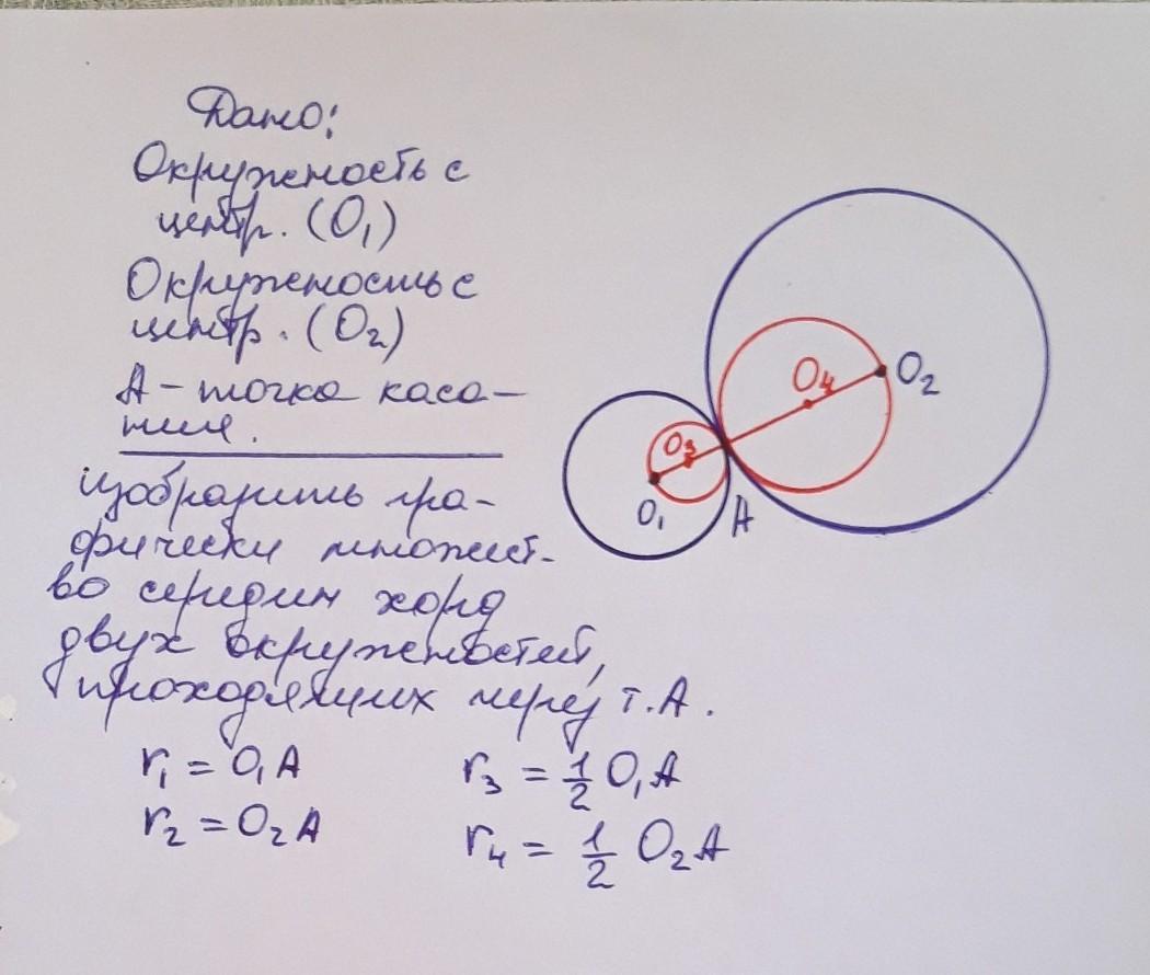 две окружности касаются друг друга внешним образом в точке A. Через точку A проводятся все возхможные прямые, пересекающие окружности в еще двух тчоках. найдите множество середин отрезков с концами в этих точках.