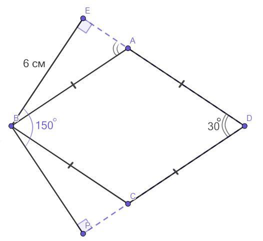 У ромбі АВСD з вершини гострого кута проведено висоти ВЕ і ВР до сторін АD і СD відповідно. Знайти периметр ромба, якщо ВЕ=6 см,а кут ЕВР =150°.