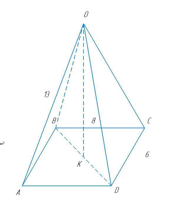 Основание пирамиды прямоугольник с основаниями 6 см, 8 см. Кажная оковая грань 13 см.