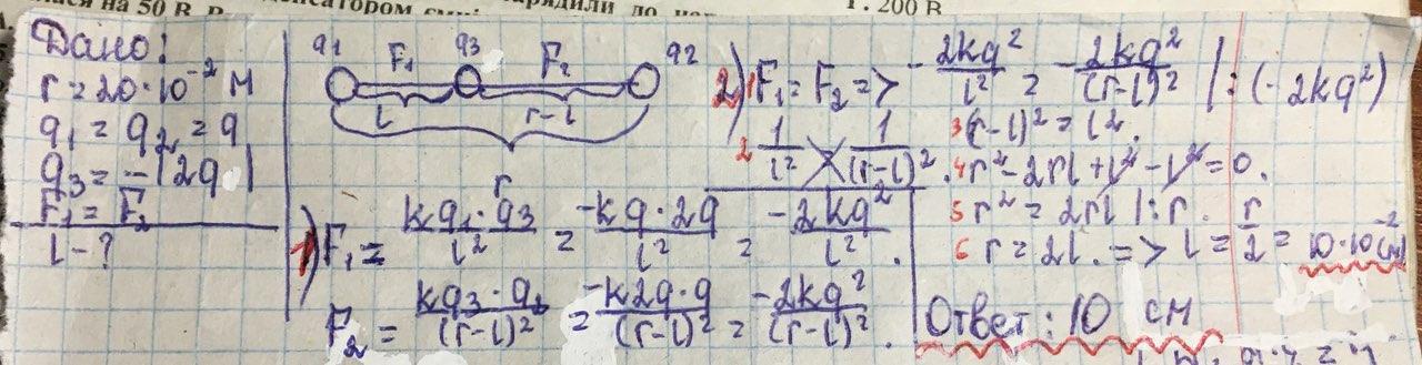 Два одинаковых точечных заряда находятся на расстоянии 20 см от друга. На каком расстоянии от первого заряда надо поместить третий заряд другого знака вдвое больший по величине, чтобы второй заряд оказался в равновесии?