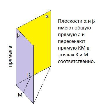Плоскости α и β имеют общую прямую а и пересекают прямую КМ в точках К и М соответственно.