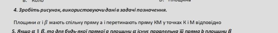 Помогите пожалуйста! Буду очень рад! 4 задание нужно. Вот перевод: Плоскость а и В имеют общую прямую а и пересекают прямую КМ в точках К и М соответственно.