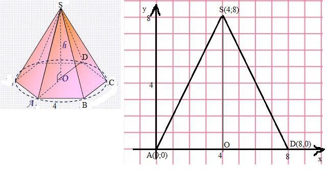 Пусть Н середина SD. Введем прямоугольную систему координат с началом в точке А и осью ох, совпадающей со стороной АD .Найдем координаты точек :А(0;0) , D(8;0) , S(4;8) .