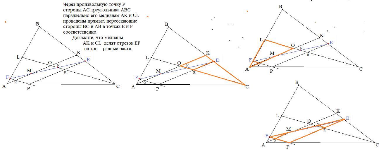 Через произвольную точку P стороны AC треугольника ABC параллельно его медианам AK и CL проведены прямые, пересекающие стороны BC и AB в точках E и F соответственно. Докажите, что медианы AK и CL делят отрезок EF на три равные части.
