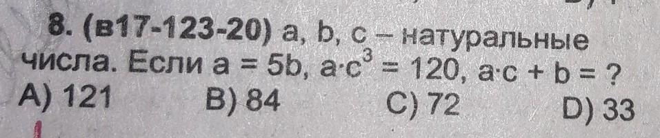 Сделаем замену а на 5b. Тогда выражение 5bc^3 = 120, можно сократить на 5. Тогда bc^3 = 24. Посмотрим какие значения может принимать с. Оказывается, что только 1 и 2 (3^3 = 27 > 24). Рассмотрим два случая: