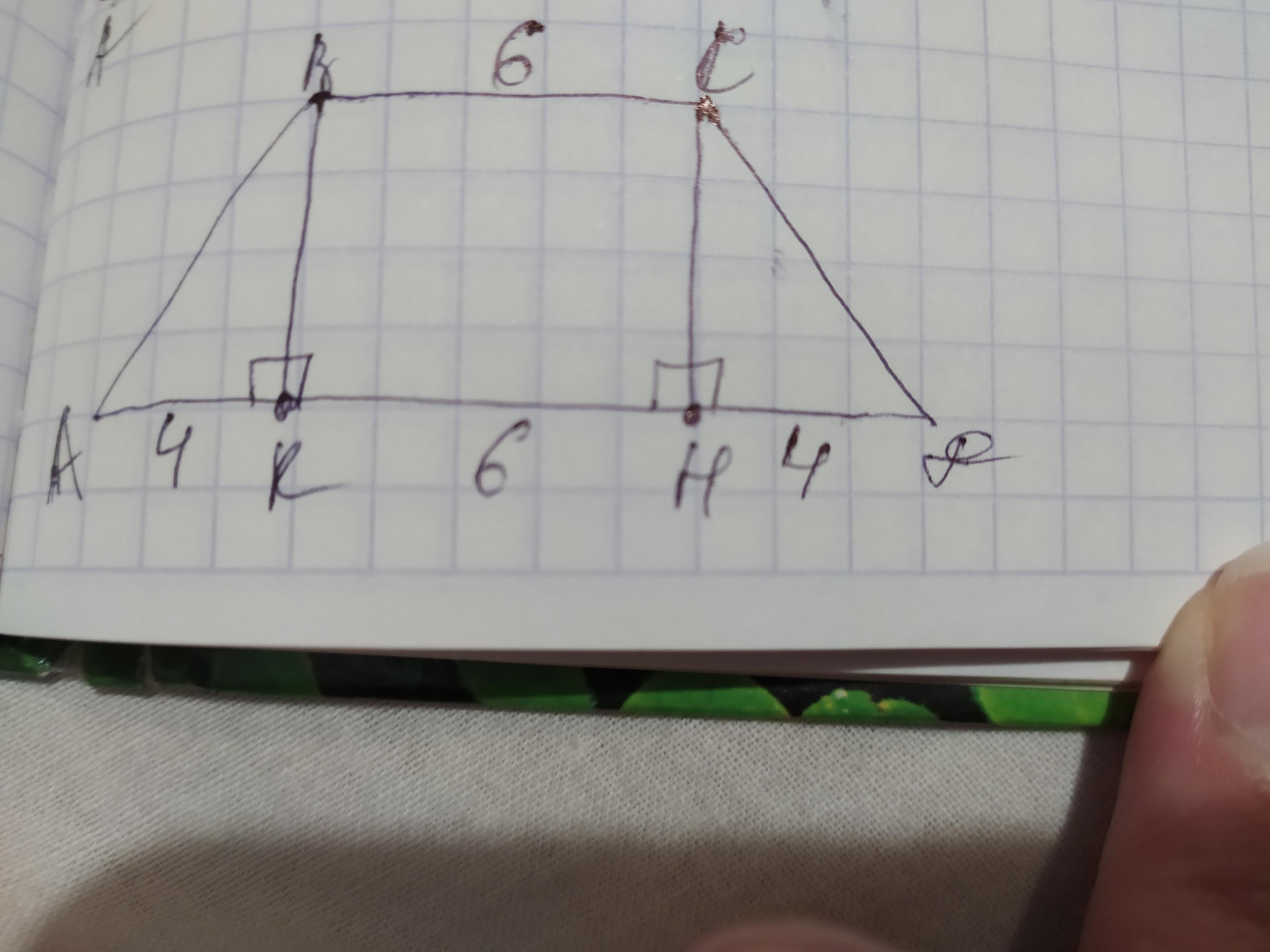 Объяснение: проведём ещё одну высоту СН. Эти две высоты делят АД так, что КН=ВС=6см. Так как трапеция равнобедренная то ДН=АК=4см, поэтому АД=4×2+6=8+6=14см. Теперь найдём среднюю линию трапеции зная её оба основания: