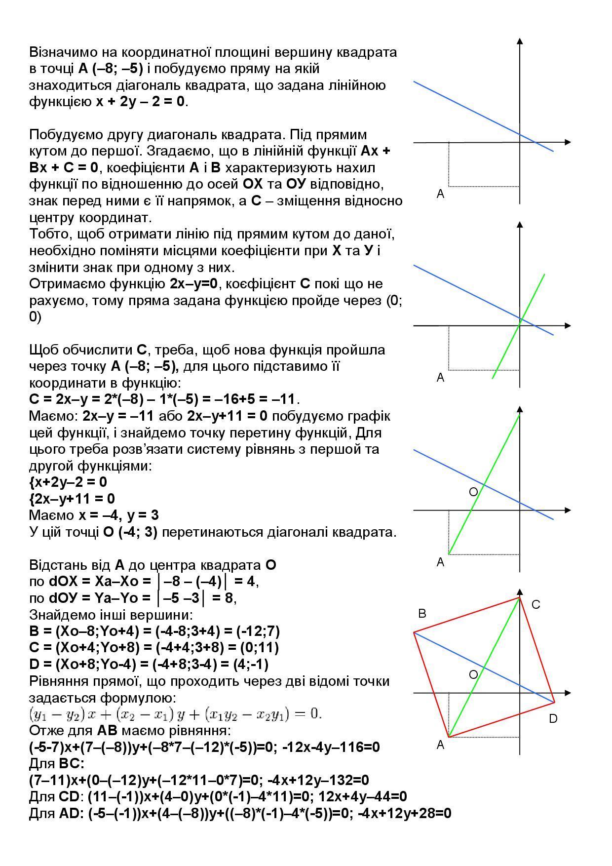 точка A (xa; ya) вершина квадрата abcd а його діагональ bd знаходиться на прямій ax+by+c =0 необхідно знайти рівні сторони AB BC CD AD та кординати вершин B C D зробіть креслення