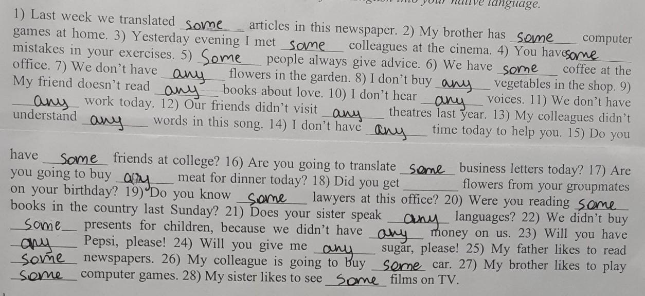 1) Минулого тижня ми перекладали деякі ігри вдома. 3) Вчора ввечері я зустрів деякі помилки у ваших вправах. 5) Якийсь офіс. 7) У нас сьогодні Мій друг не читає жодної роботи. 12) Наші друзі не відвідували жодного. зрозуміти статті в цій газеті. 2) У мого брата є декілька колег з комп’ютера в кінотеатрі, 4) Ви маєте трохи кави в овочах в магазині. 9) голоси. 11) Ми не мали театрів минулого року. 13) Мої колеги сьогодні не встигли вам допомогти. 15) Чи завжди вам люди дають поради. 6) У нас в саду є кілька квітів. 8) Я не купую жодної книги про кохання. 10) Я не слухаю жодної слова в цій пісні. 14) У мене немає жодного ви збираєтесь купувати ОМ на день народження? 19) Чи знаєте ви деякі книги в країні минулої неділі? 21) Чи говорить ваша сестра якась. Якісь друзі в коледжі? 16) Чи збираєтесь Ви сьогодні перекласти деякі ділові листи? 17) Чи квіти у ваших одногрупників адвокати в цьому офісі? 20) Чи читали ви 5 якихось мов? 22) Грошей у нас не купували. 23) Чи будете мати цукер, будь ласка! 25) Мій батько любить читати деякі газети. 26) Мій колега збирається купити машину. 27) Мій брат сьогодні любить грати м'ясо на вечерю? 18) Чи отримали ви подарунки для дітей, тому що у нас не було жодної Pepsi, будь ласка! 24) Чи дасте ви мені будь-яку. Деякі комп’ютерні ігри. 28) Моя сестра любить переглядати деякі фільми по телевізору.