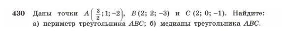 В ΔАВС найти периметр и длины медиан, если А(3/2 ;1;-2) , В(2;2;-3) , С(2;0;-1).