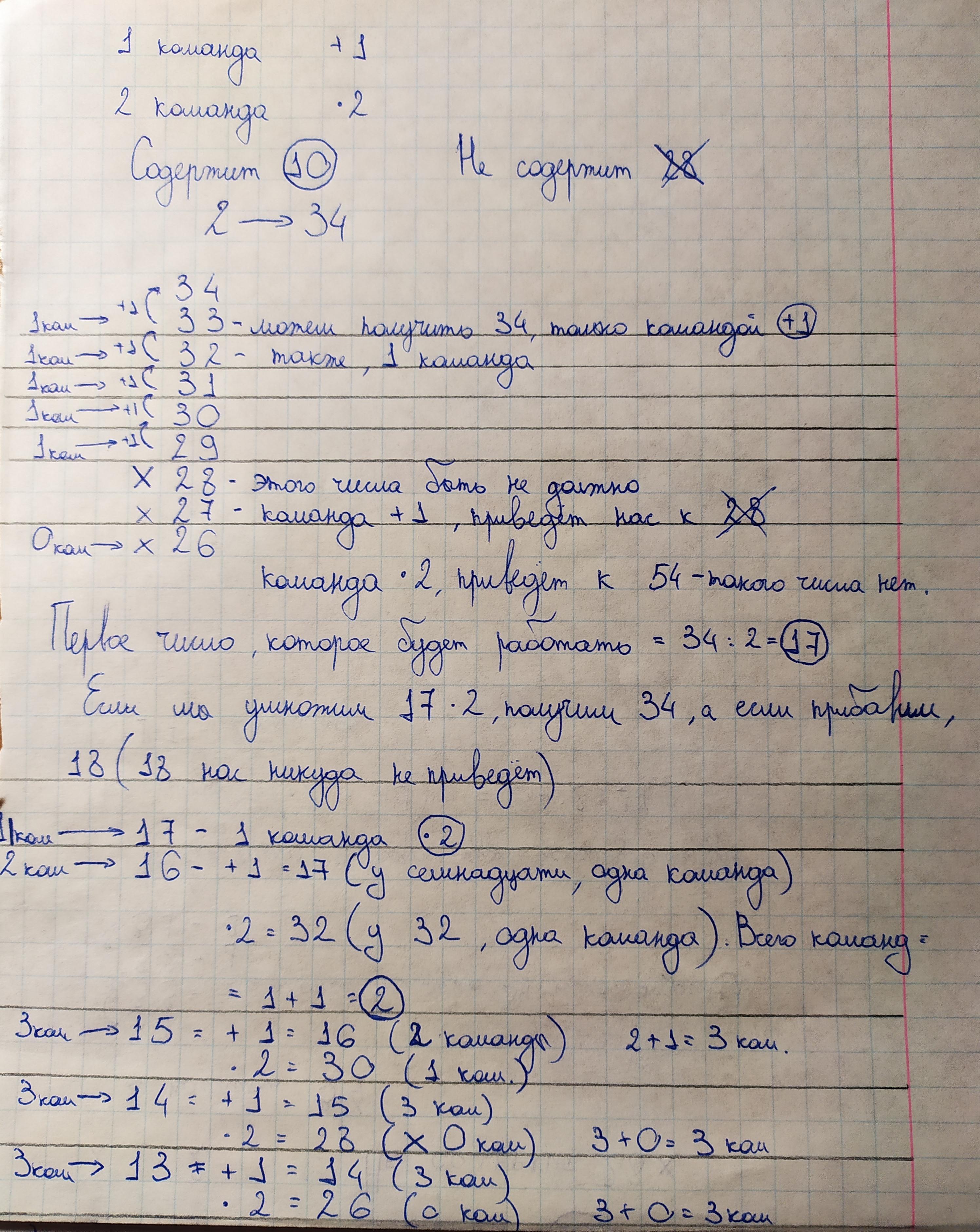 Программа для исполнителя Калькулятор – это последовательность команд. Сколько существует программ, для которых при исходном числе 2 результатом является число 34 и при этом траектория вычислений содержит число 10 и не содержит числа 28?