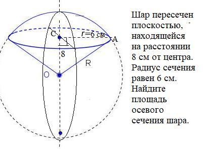 Шар пересечен плоскостью, находящейся на расстоянии 8 см от центра. Радиус сечения равен 6 см. Найдите площадь осевого сечения шара.