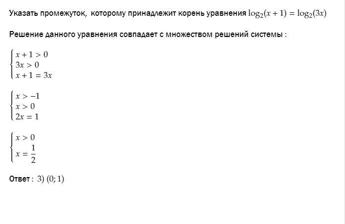 Указать промежуток, которому принадлежит корень уравнения log2(х+1)= log2(3х)