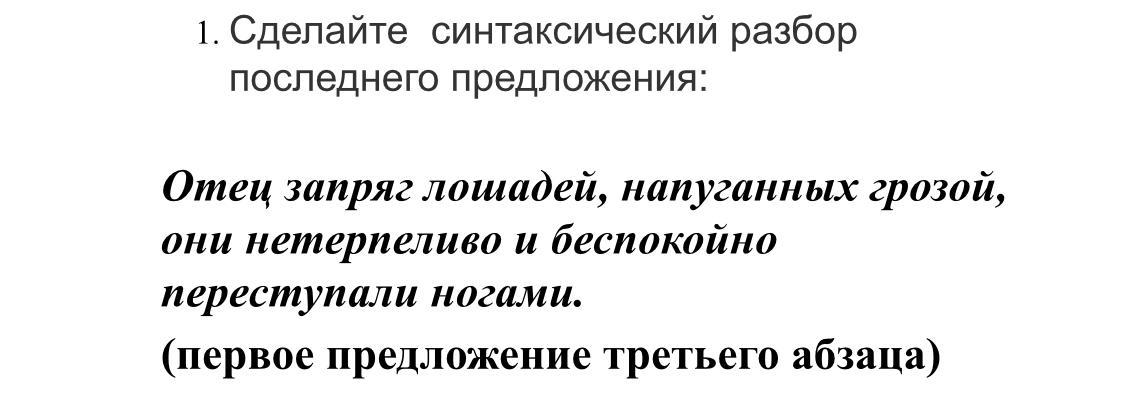 повеств.,невосклиц., распростр.,сложное,бессоюзное,соожноподчиненное,осложнено прич.оборотом,основа первого отец запряг,второго они переступали