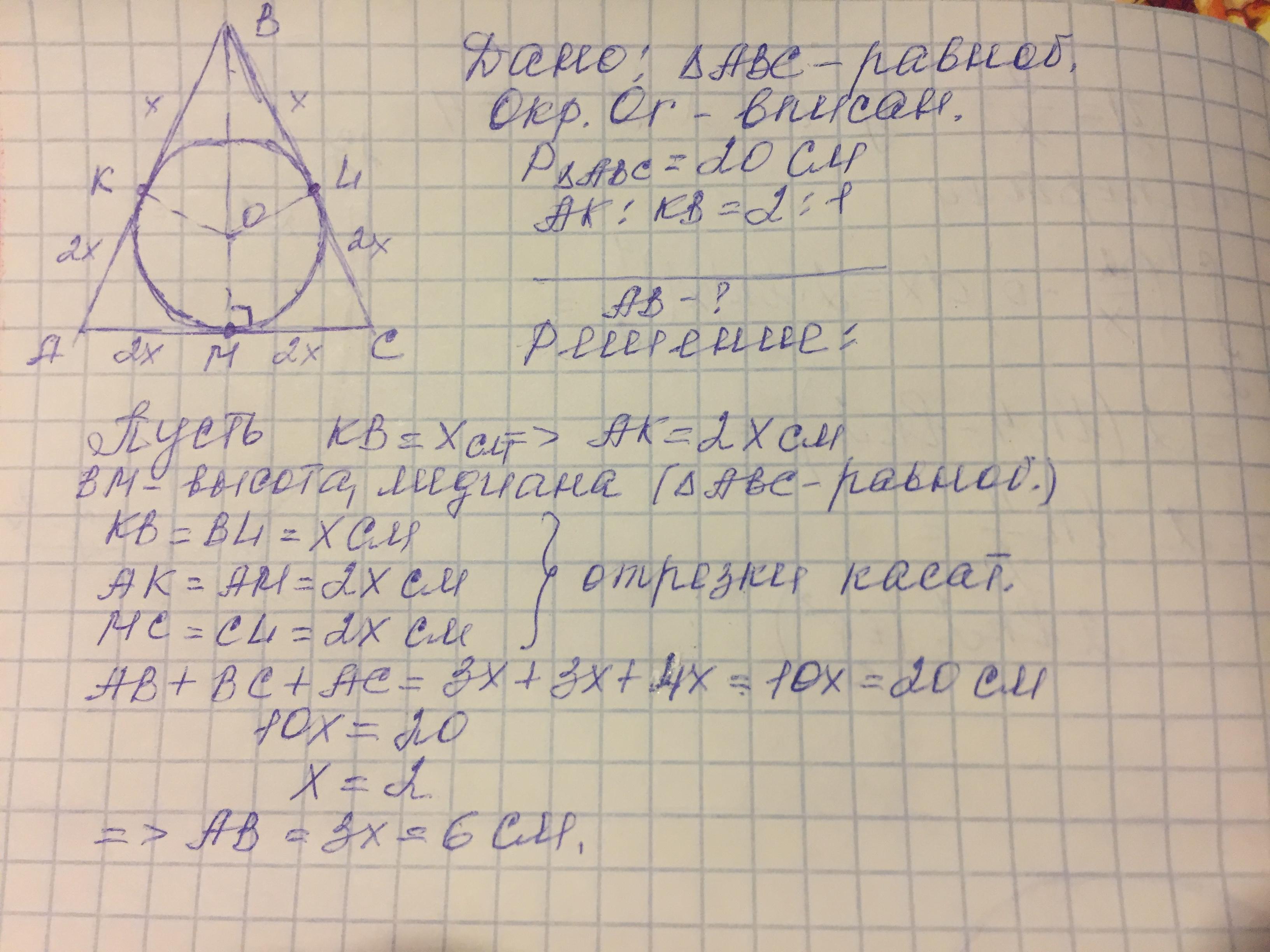 В равнобедренный треугольник АВС с основанием АС вписана окружность, K, L,M – точки касания. Найдите АВ, если периметр треугольника АВС равен 20 см и АК : КВ = 2 :1