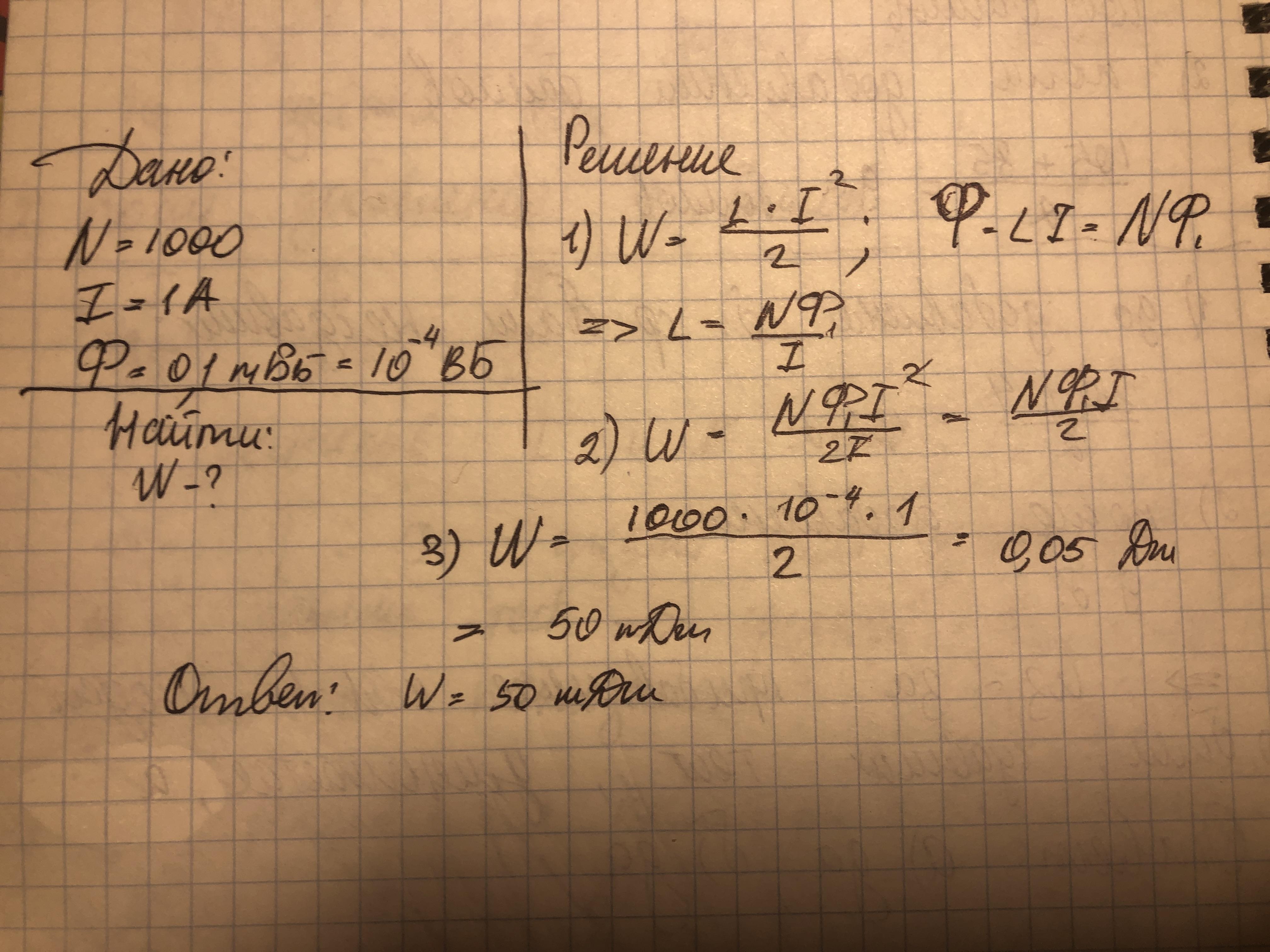 Соленоид содержит 1000 витков. Сила тока в обмотке соленоида равна 1 А, магнитный поток 0,01 Вб. Определить энергию магнитного поля.