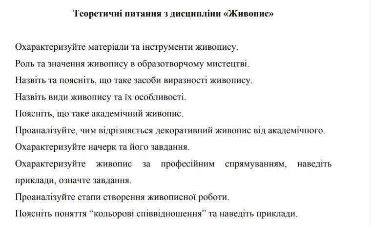 4. Існує п’ять основних видів живопису: станковий, монументальний, декоративний, театрально-декоративний, мініатюра.