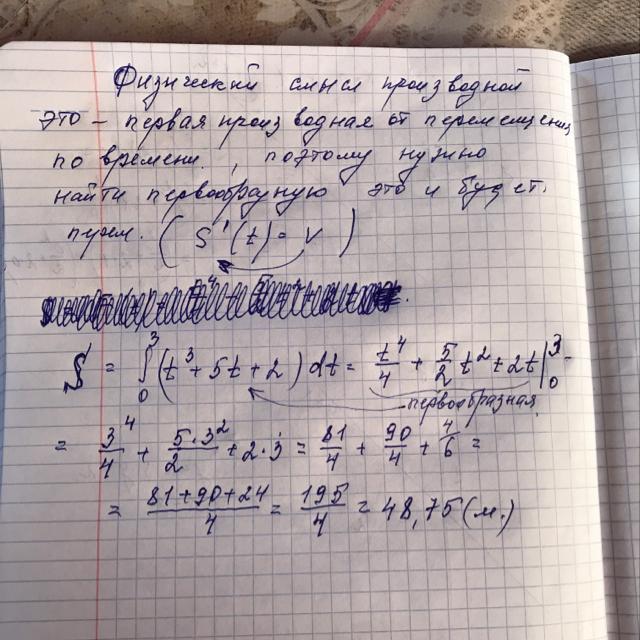 Помогите решить задачу. Скорость прямолинейного движения автобуса равна v=f(t)= t^3- 5t+2(м/с). Вычислите путь, пройденный телом за первые 3 секунды от начала движения. С объяснением, пожалуйста.