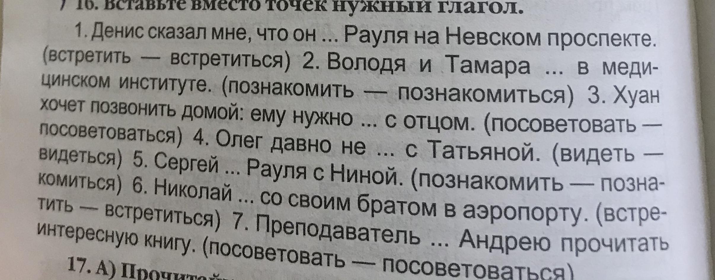 Денис сказал мне, что он встретит Рауля на Невском проспекте. Володя и Тамара познакомились в медицинском институте. Хуан хочет позвонить домой: ему нужно посоветоваться с отцом. Олег давно не виделся с Татьяной. Сергей познакомил Рауля с Ниной. Николай встретился со своим братом в аэропорту. Преподаватель посоветовал Андрею прочитать интересную книгу.