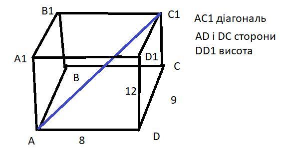 Якщо виміри прямокутного паралелепіпеда дорівнюють 8 , 9 і 12 см, то скільки дорівнює його діагональ? З малюнком будь ласка