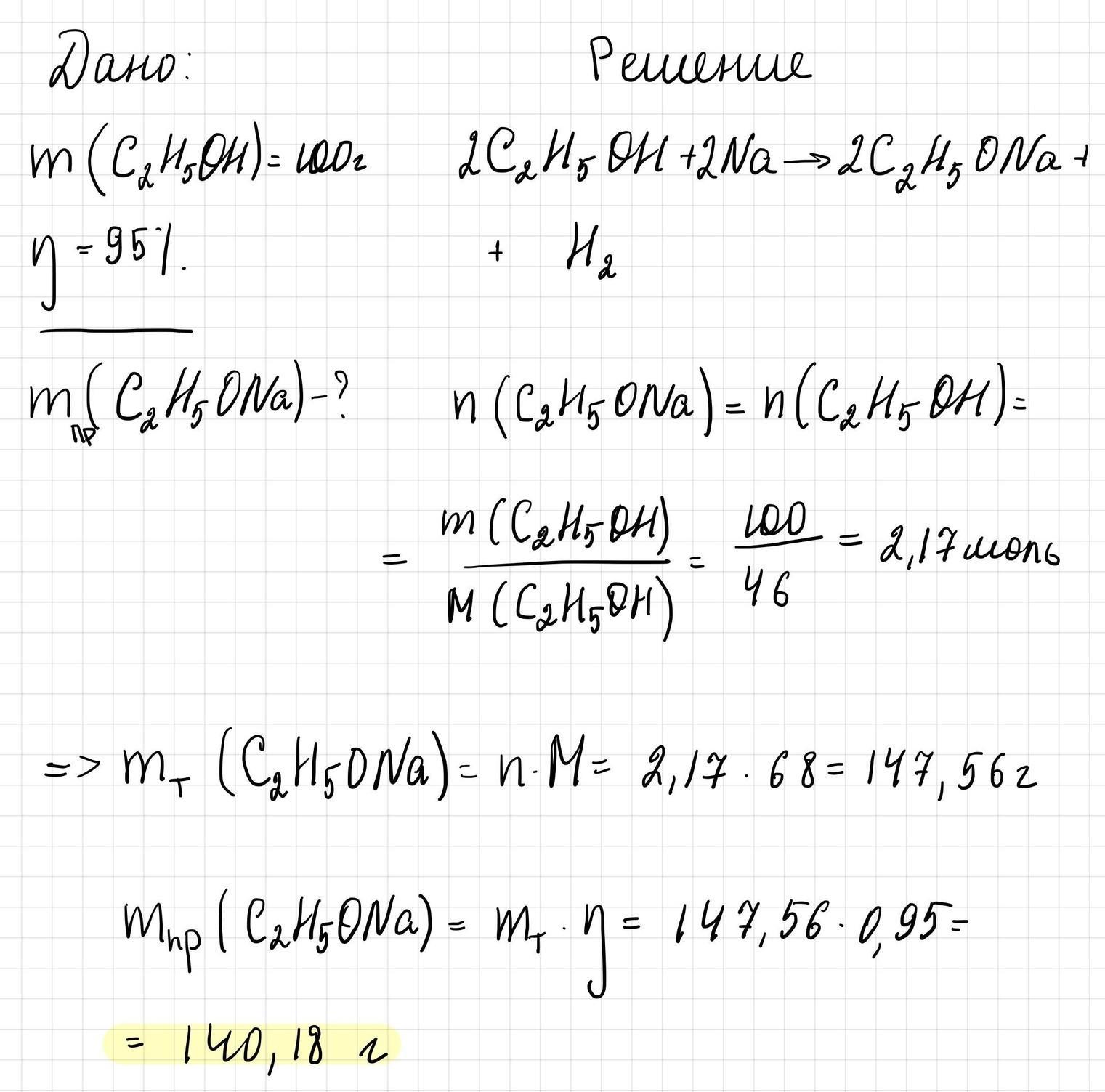 При взаимодействии натрия с 100г этиловым спиртом образовался этилат натрия. Найдите его массу, если практический выход продукта реакции составил 95% по сравнению с теоретическим.