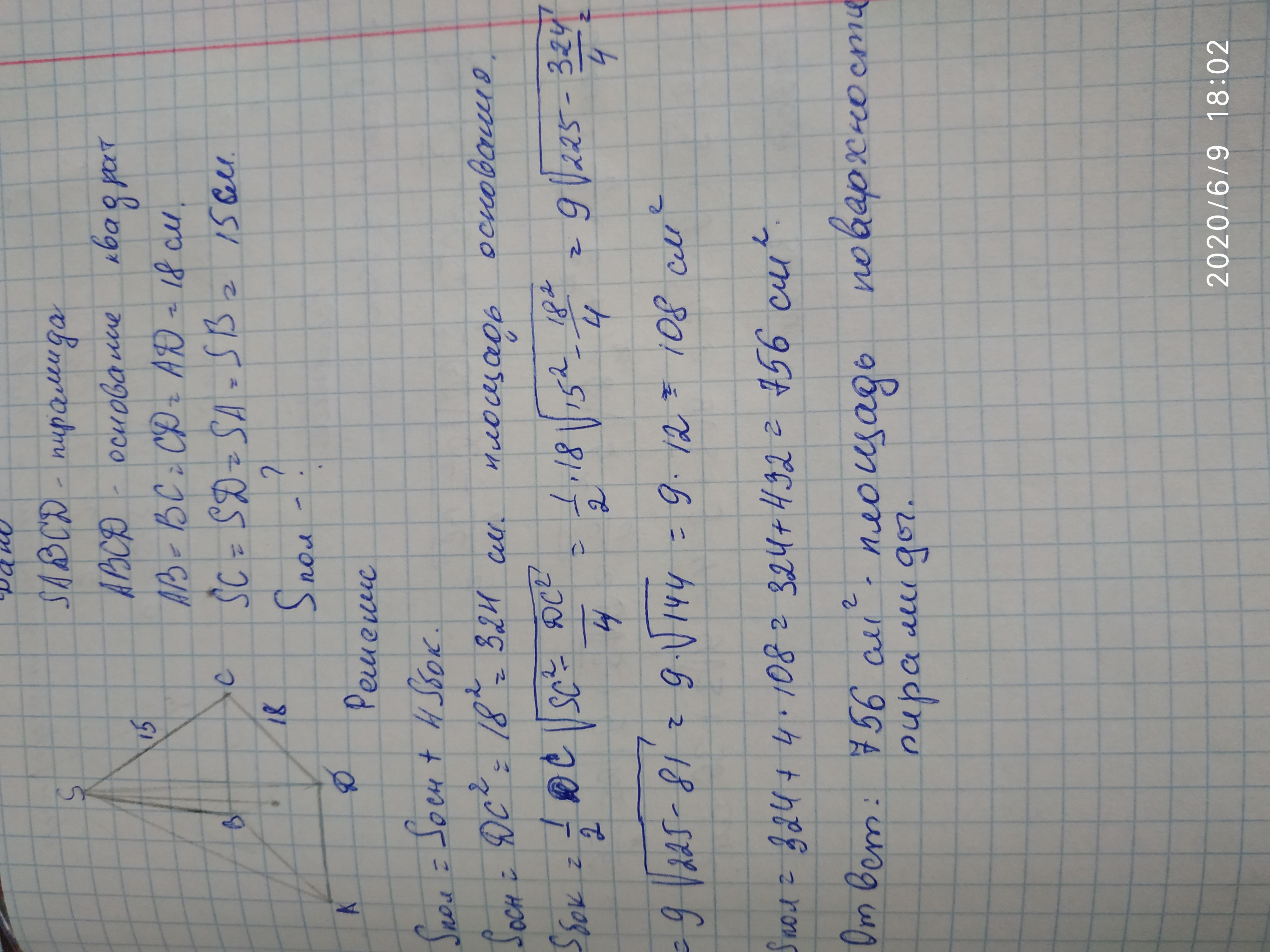 1.Задание..Дана правильная 4-ая пирамида. Сторона основания18см, боковое ребро 15см. Найдите площадь полной поверхности пирамиды.